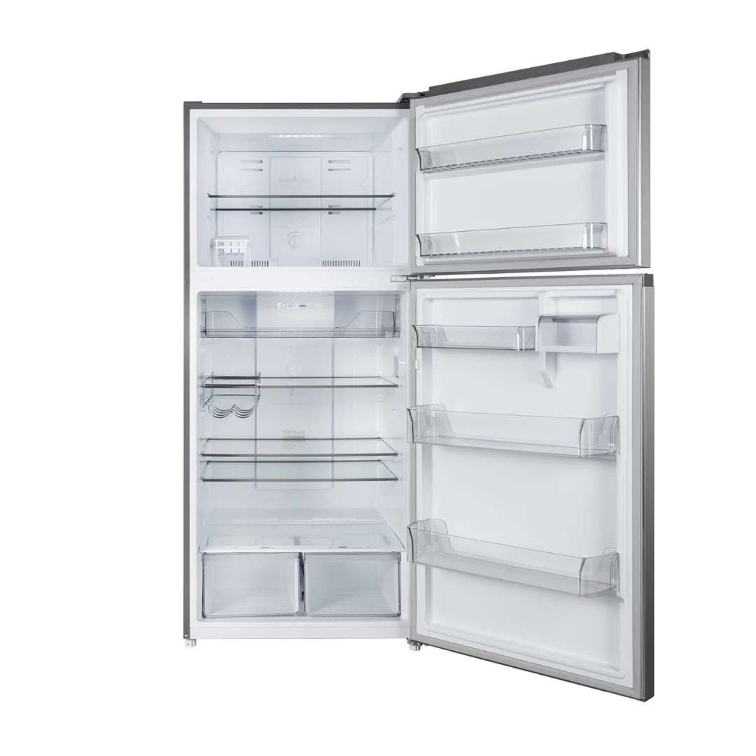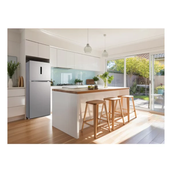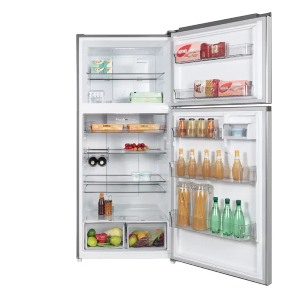 The CHiQ 515L Top Mount Fridge offers advanced cooling technology paired with convenient features for optimal food preservation. Its efficient inverter system operates quietly, helping to prolong the freshness of your food while reducing energy usage. With a digital display on the door, you can easily adjust the temperature to your liking. The Multi Air Flow system ensures even and rapid cooling across all shelves, maintaining consistent freshness. The Fresh Room, set at a lower temperature, is ideal for keeping fish and meat fresh for longer. Additionally, the humidity-controlled crisper helps preserve the quality of fruits and vegetables. Both the freezer and refrigerator sections are equipped with LED lighting for enhanced visibility, making it easy to locate items. The easy-access ice box, featuring a space-saving design and two ice trays, makes ice retrieval simple and efficient.