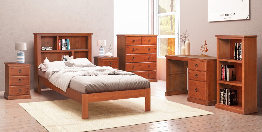 The Atlas bedroom range features traditionally styled furniture that will suit both boys and girls. Suite includes single bed, bedside table (one only), tallboy, desk and bookcase.
