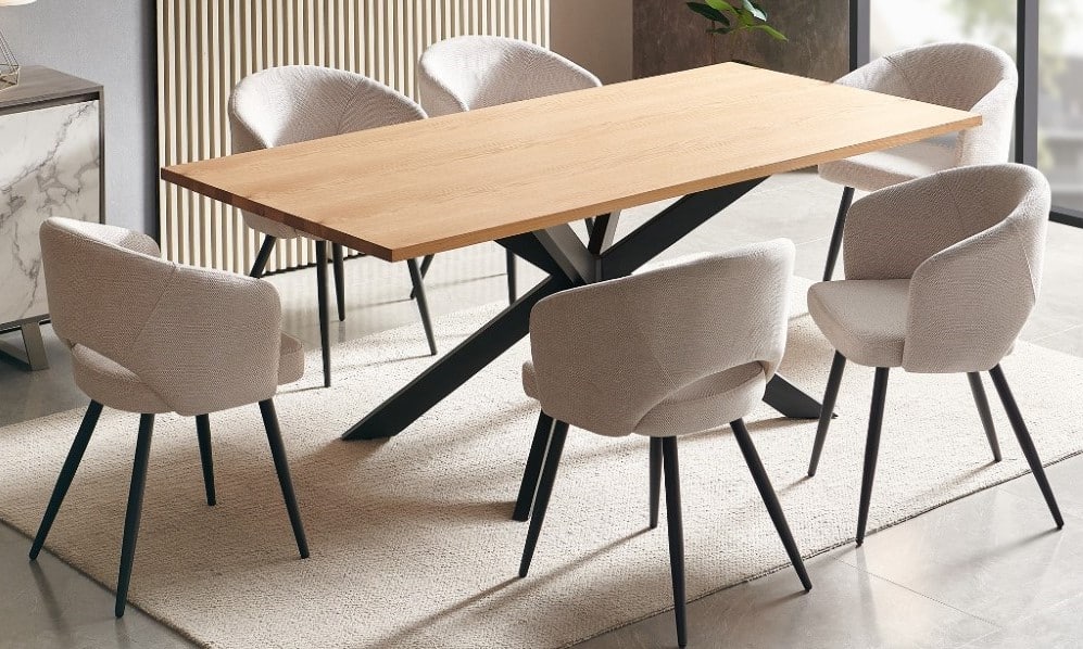 The Barlow Dining Suite boasts a striking industrial design, featuring a stunning natural oak veneer tabletop paired with bold, geometric black metal legs and six coordinating Matzo dining chairs to perfectly complement the table’s modern aesthetic. This suite seamlessly blends contemporary style with timeless elegance, making it a standout addition to any dining space.