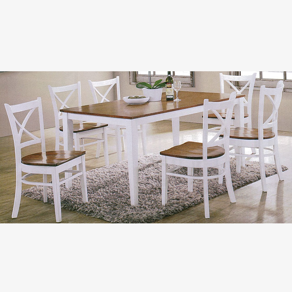 The Crossback 6 seat dining suite is a lovely country-style set, with two-tone white frame and antique oak colour table top.