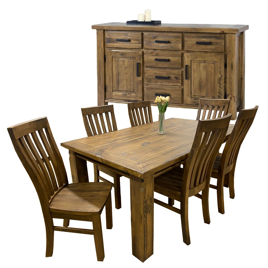 The Haus range is sure to be a favourite in your home and will add warmth with timber finished in an aged sundried ash. This package includes 7pc dining suite and buffet.