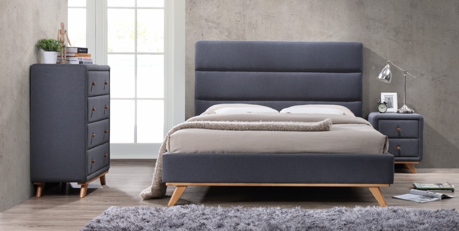 If you’re looking for a stunning and luxe bedroom suite, the Leia is ideal. It has grey linen upholstery with modern splayed timber legs. This suite includes queen bed, 2x 2 drawer bedside tables & 4 drawer tallboy.