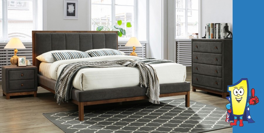 The Sansa bedroom suite is sophisticated and oozing style. It has a timber frame with a walnut finish and dark grey linen upholstery. This suite includes a queen bed, 2x 2 drawer bedside tables & 4 drawer tallboy.