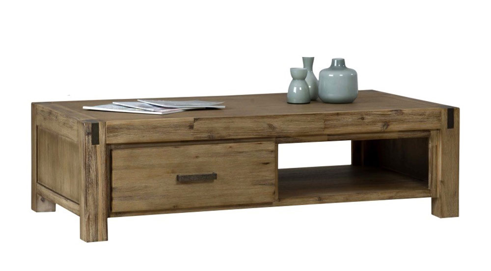 Looking for furniture with a hint of industrial style? The Sterling range features brushed metal corner detailing and a silver brush finish over acacia wood. This coffee table has a cubby and drawer to store small items.